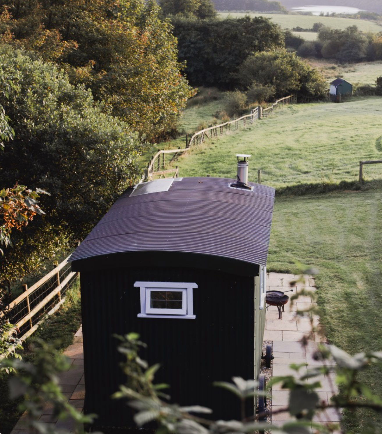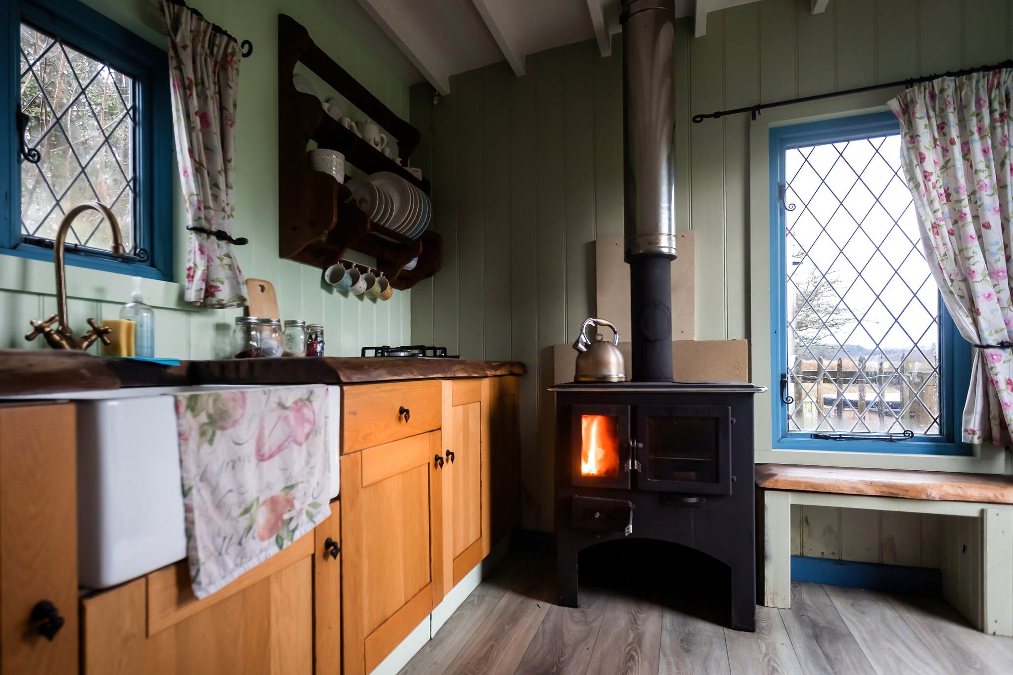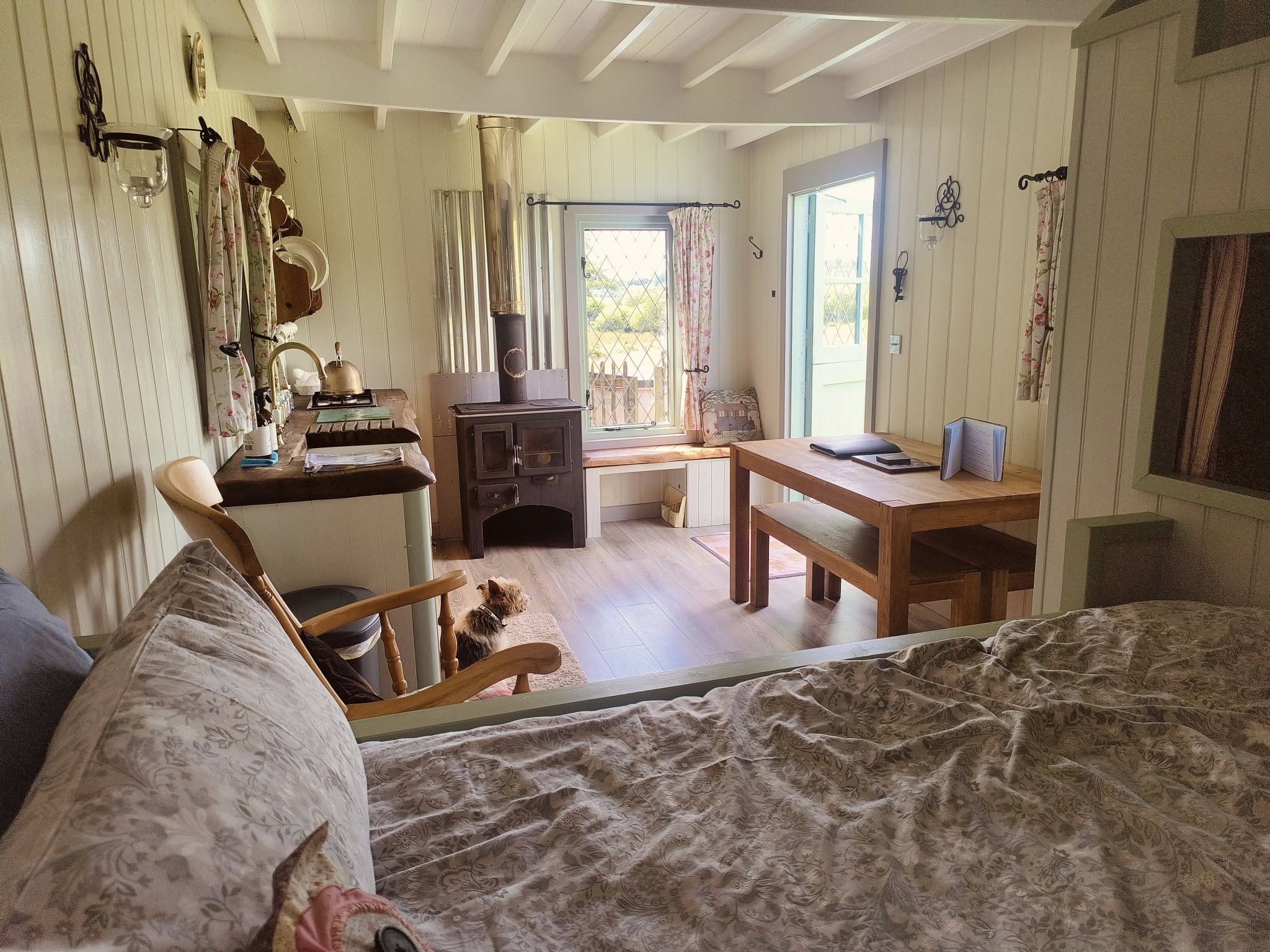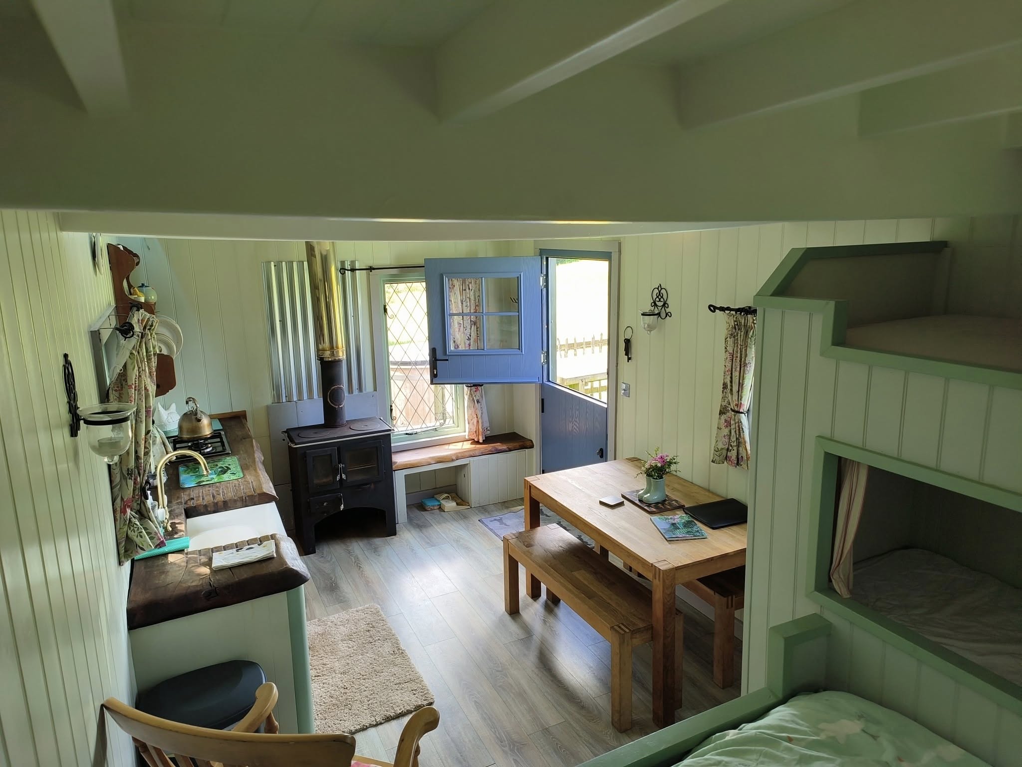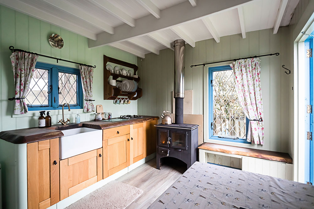 Our lovely Drovers Hut is built on a WW2 army ammunitions trailer. It was bought by a local farmer who planned to use it for hay bales. We found the trailer in a hedge covered in ivy, with a tree growing through it. We decided to buy it, to give it some well-earned TLC, turning it in to this lovely, cosy, romantic hut.